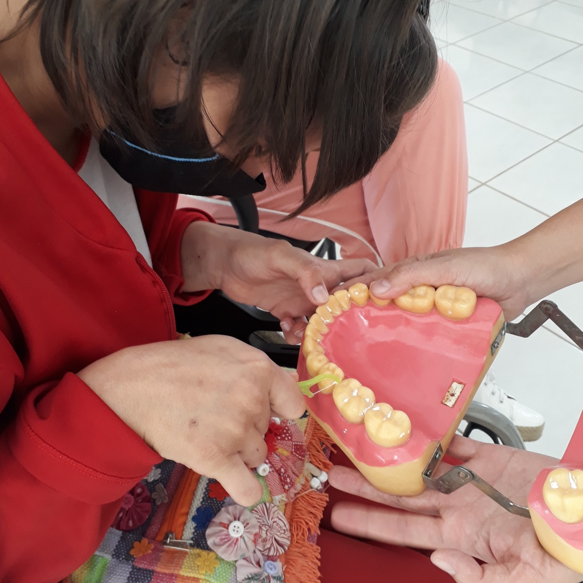 A prática ajudou na segunda parte do encontro, em que fizemos uma roda de perguntas e repostas. Agregando perguntas e rotinas da vida diária das usuárias e dos funcionários participantes, como: o uso do fio dental, escova correta, tempo de escovação, produtos complementares, durabilidade da escova e os riscos que a má escovação e a negligencia na saúde bucal pode causar.